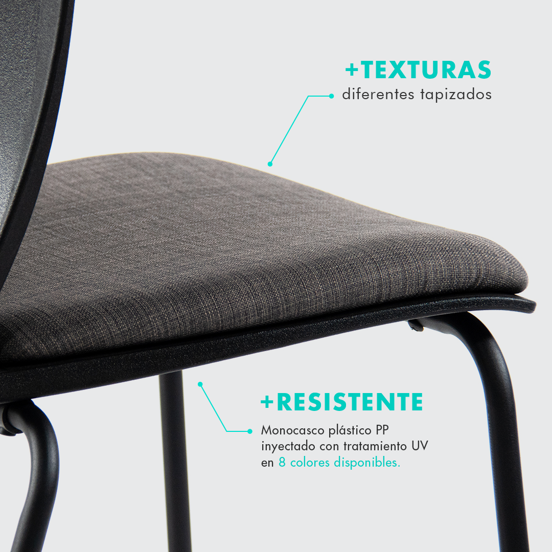 - Estructura 4 patas de caño redondo de 1.6mm de espesor pintado en Negro, Gris o Blanco mate microtexturado.